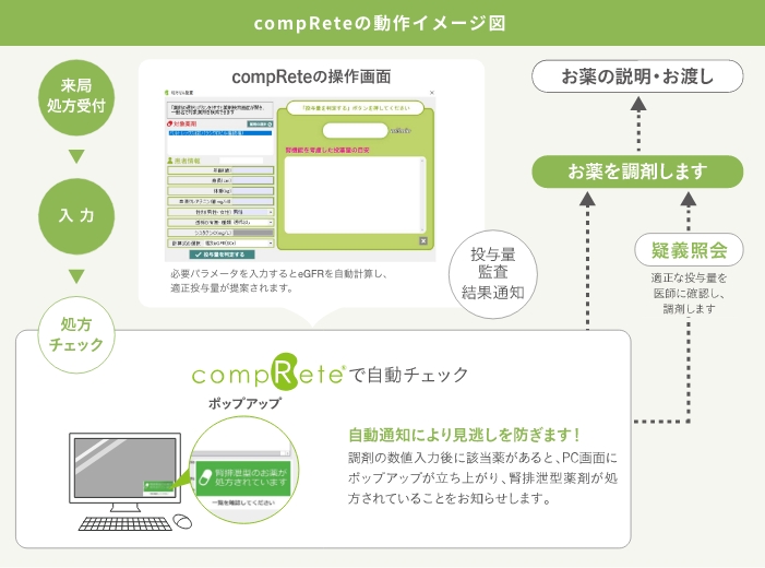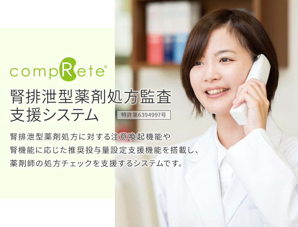多忙な薬局薬剤師を支援するため、これまでのレセコン業務に付加できる画期的なシステム「compRete(コンプリート)」を開発しました。患者の腎機能に合わせて投与量を調節する専門的で細やかな処方設計が可能となり、効率的に業務を進められます。