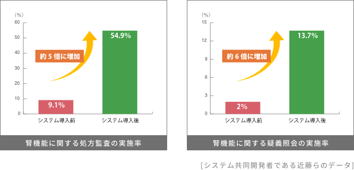 本製品には、医療機器に該当する機能は含まれておりません。本製品がチェックする薬剤や用量チェックなど処方監査に係る結果は、日本腎臓病薬物療法学会が提供している「腎機能低下時に最も注意が必要な薬剤投与量一覧(最新版)」に基づき作成しています。調剤に係る決定は、薬剤師の判断で行ってください。医薬品に係るデータベースは、随時更新を行っておりますが、常に最新の情報を提供できない場合がございます。ご了承の上ご利用ください。
